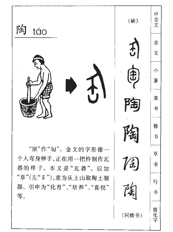 在甲骨文中,“陶”的形象是一个人蹲坐在地上,使用一根木棍之类的工具给粘土做造型,然后将其进行烧制便形成了陶。